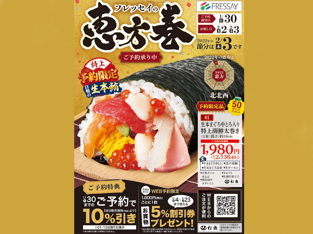 今年も、節分スイーツや韓国料理風の恵方巻など、様々なグルメが節分を彩っていますよ! 今回は、"関西で買える恵方巻&節分スイーツ"をまとめてご紹介します! 1:贅沢素材を使った「イオンの恵方巻」 画像:イオン株式会社